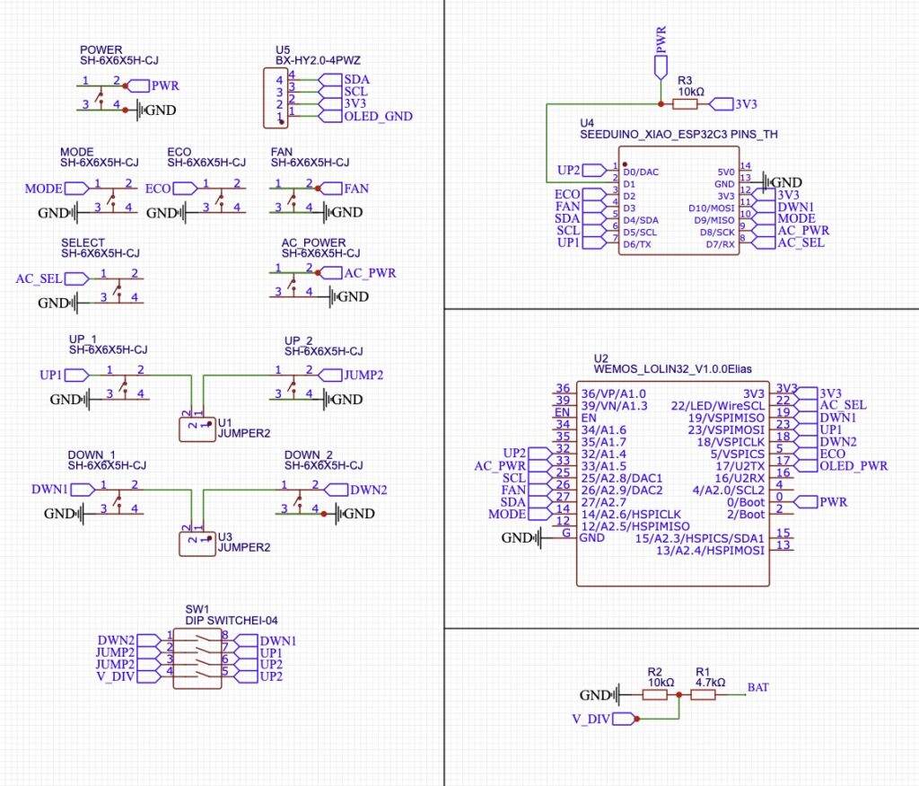 In this design, two switches are used together to operate each of the long buttons (Temperature Up and Down). This approach minimizes wobbling when pressing the buttons and leaves the option to later redesign them as two independent buttons if additional features are needed.